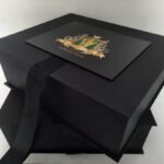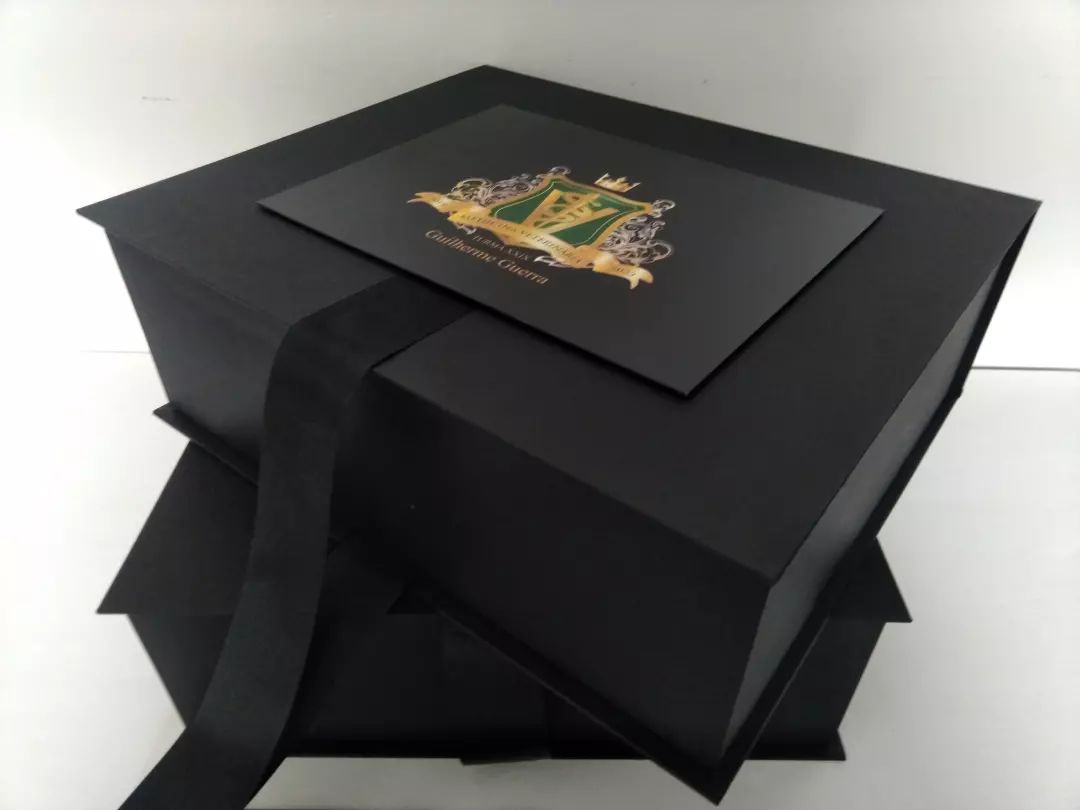 Caixa com fechamento em fita cetim.